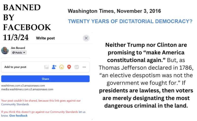 The opening sentence set the tone: “The 2016 election campaign is mortifying millions of Americans in part because the presidency has become far more dangerous in recent times.” Facebook always gives users the option to “share” a “Memory” link. I tapped the button to automatically send a notice on “Dictatorial Democracy” to all my Facebook friends and followers. No such luck: Facebook notified me that they had banned sharing the piece because it violated Facebook “Community Standards.”