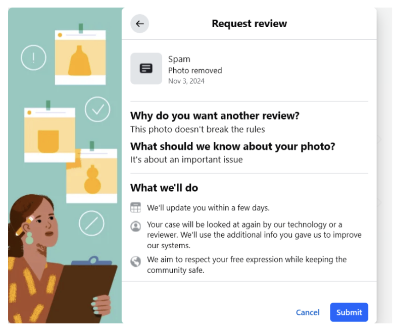 Facebook notified me that I could appeal their ruling. Fine – I can explain their blunder in three sentences. No such option. Instead, they offered a series of pages where I could check a box that looked like it was designed for kindergarten. “It’s not offensive in my region” – ya, that’s a great option to sway the Facebook Content Moderation Police in Manila. I am pretty sure that the Facebook Appellate Division never sent me their verdict on this content.