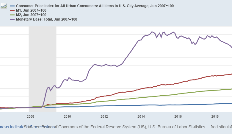 In money and banking textbooks, the monetary base and the money stocks (whether M1, M2, or M3) are supposed to move together closely. And, with certain assumptions, the price level is also supposed to track changes in the money supply. That’s not what we see in Figure 1, which shows different growth rates for money aggregates and inflation from June 2007 to 2019 (prior to the changed calculation of M1).