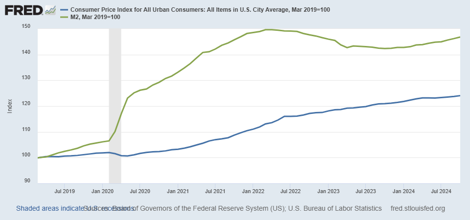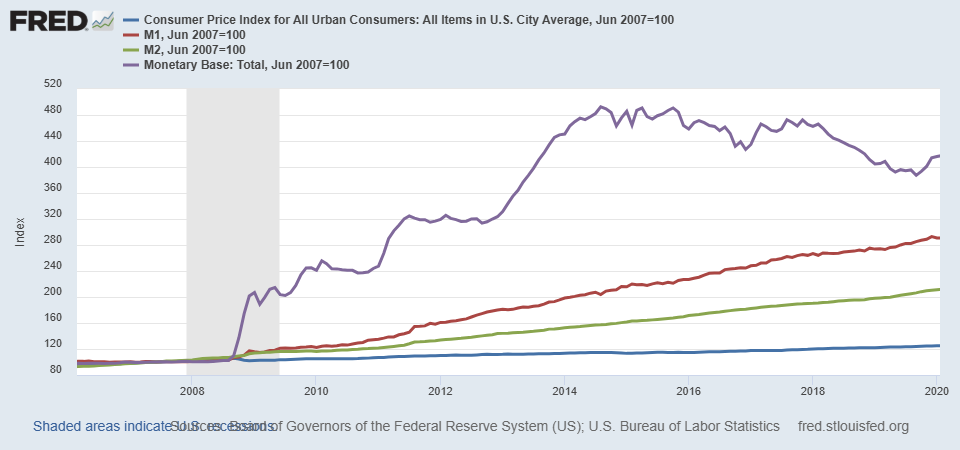 Economists argued two things to explain the ’07 to ’19 period. First, they argue that restrictive regulations and the Fed paying interest on reserves significantly weakened the link between the monetary base and M2. Second, they argue that the velocity of money fell over this period, offsetting some of the increase in M2. That’s why we saw low inflation rather than high inflation over this period.