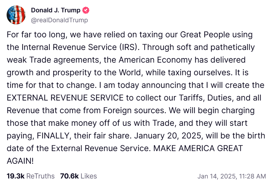 President-elect Donald Trump has floated the idea of creating an External Revenue Service, which he claims will be used to “collect our Tariffs, Duties, and all Revenue that come from Foreign sources” (sic). While we might applaud his rhetorical flair, his choice of words belies a fundamental misunderstanding of how tariffs actually work.