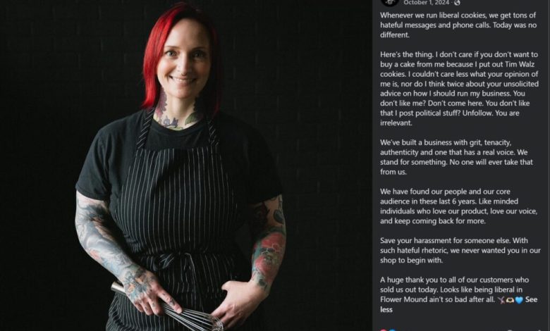 Here’s the thing. I don’t give a f– if you don’t want to buy a cake from me because I put out Tim Walz cookies. I couldn’t care less what your opinion of me is, nor do I think twice about your unsolicited advice on how I should run my business. You don’t like me? Don’t come here. You don’t like that I post political s–t? Unfollow. You are irrelevant.