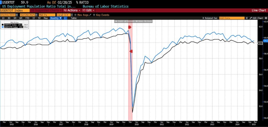 7. US Employment-Population Ratio, Total Labor Force (Seasonally and Not Seasonally Adjusted) (US Bureau of Labor Statistics)