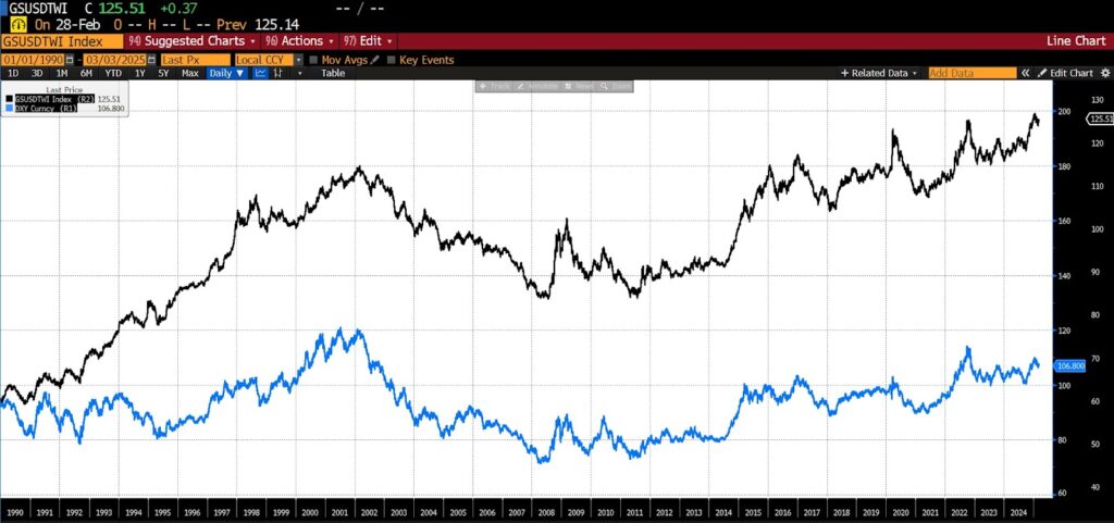 To fully assess the dollar’s strength since the end of the Cold War, the most relevant metric is the trade-weighted US dollar (TWUSD), which considers exchange rates with a broader range of trading partners, including China and Mexico — two of the largest recipients of outsourced American manufacturing. In contrast, the more commonly cited US Dollar Index (DXY) primarily tracks the dollar against a limited basket of six currencies (euro, yen, British pound, Canadian dollar, Swedish krona, and Swiss franc) and fails to capture broader trade dynamics.