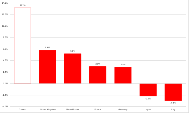 This is because, as Paul Krugman wrote: “Productivity isn’t everything, but in the long run it is almost everything. A country’s ability to improve its standard of living over time depends almost entirely on its ability to raise its output per worker.” And Canada’s record on raising output per worker is poor. As Figure 4 shows, GDP per person employed increased, in real terms, by just 0.1 percent between 2014 and 2023, a rate better than only Japan among the G7 countries. This is not new. Among its G7 peers, Canadian GDP per person employed ranks fifth in every single year from 1990 onwards.