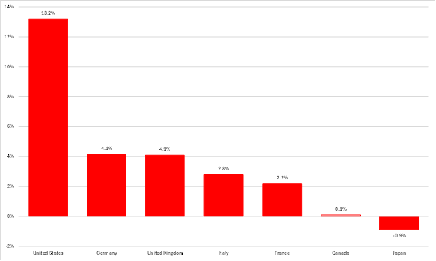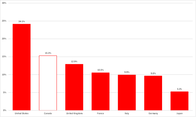 What accounts for this dismal performance? GDP per capita is calculated by simply dividing total GDP by the population. Canada’s record on total GDP growth is relatively strong. Between 2014 and 2023, the Canadian economy grew by 15.3 percent in real terms, second only to the United States among the G7 countries, as Figure 2 shows. But while the numerator in our equation – GDP – has grown rapidly, so has the denominator, population. Between 2014 and 2023, Canada’s population grew by 13.2 percent, the fastest rate in the G7 and more than double that of the second-placed United Kingdom, as Figure 3 shows.