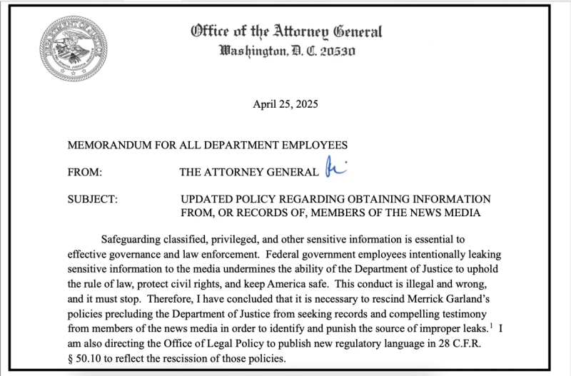 Bondi’s memo rolls back some of the protections introduced by former Attorney General Merrick Garland, in order to restore the DOJ’s ability to investigate leaks under strict conditions.