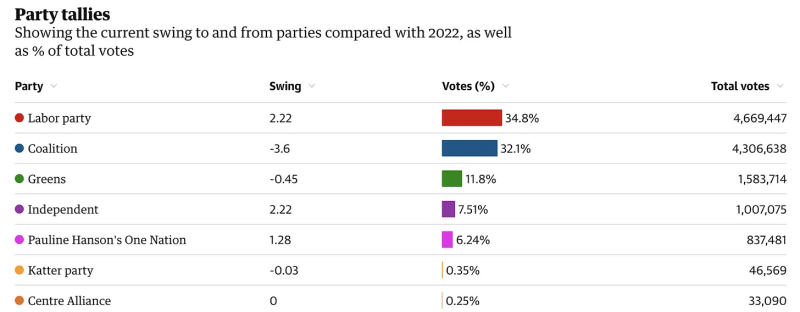 Unsurprisingly, the party secured no seats, and I am left wondering if this is Palmer’s performance art. In the past two federal elections, he threw over $200 million ($83 million in 2019 and $132 million in 2022) at campaigning for the United Australia Party, gaining only one Senate seat in 2022. As of yesterday, Palmer had reportedly announced that he will quit politics for good.