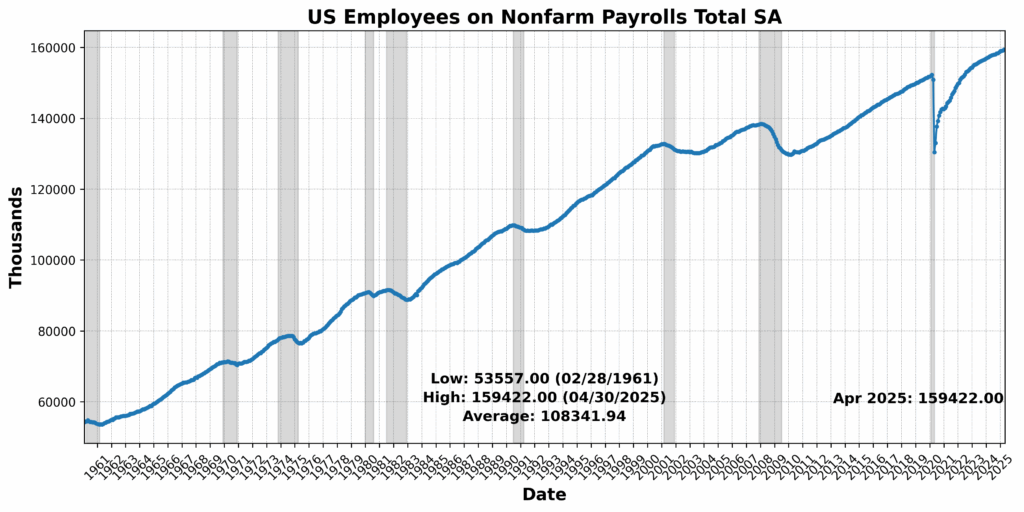 Labor market conditions in May suggest a slow-burn deterioration beneath a still-stable surface. Headline nonfarm payrolls rose by 139,000 — modestly above expectations — but downward revisions to previous months and a flat unemployment rate of 4.2 percent conceal deeper fragilities. ADP’s private payroll data showed only 37,000 jobs added, the weakest in two years, with business services, education, and manufacturing shedding workers. Sectors most exposed to tariffs — like transportation and manufacturing — continued to underperform, while job losses in temporary help and federal employment signal growing caution. Hiring is clearly slowing, but employers are not yet engaging in mass layoffs — what some economists describe as a “low-hiring, low-firing” equilibrium. The labor force shrank by over 600,000 in May, and long-term unemployment as a share of total joblessness remains elevated at over 20 percent, despite a superficial decline. Meanwhile, wage growth — at 3.9 percent year-over-year — remains resilient, reflecting firms’ reluctance to shed workers despite cost and demand uncertainty.