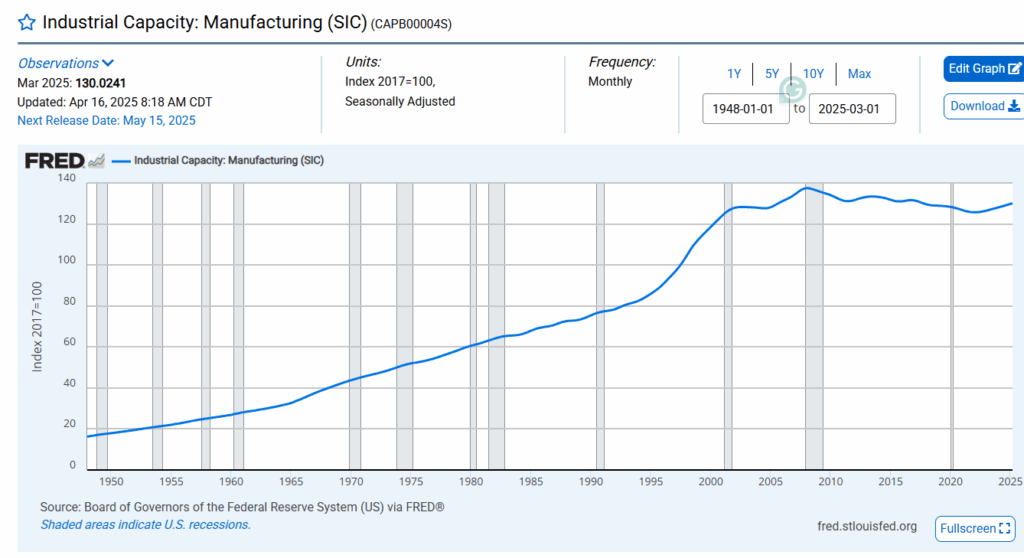 They must also recognize certain truths about manufacturing. Despite the narrative US manufacturing has been “hollowed out” by trade agreements, capacity has increased more than 50 percent since NAFTA was signed and remains at near-historic highs.