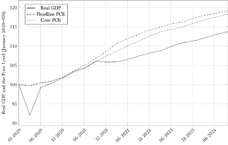 Figure 1 plots both headline and core personal consumption expenditures (PCE) indices from January 2020 alongside the Fed’s two-percent target growth path, offering a clear view of when — and by how much — the price level diverged from the Fed’s target. As the figure makes clear, both headline and core PCE inflation initially fell below the Fed’s target, but the decline was brief. By March 2021, the price level had fully returned to the target path, and in the months that followed, surged past it.