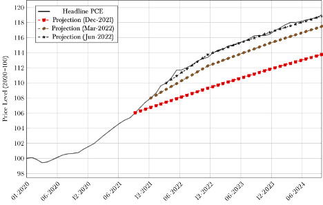 To illustrate how quickly prices outpaced FOMC projections following their acknowledgment of demand-side pressures in December 2021, consider the price level paths implied by the median FOMC member’s inflation projections in December 2021, March 2022, and June 2022. In each case, the implied price level begins with the most recent month for which data was available at the time of the projection. Figure 4 presents the resulting series.