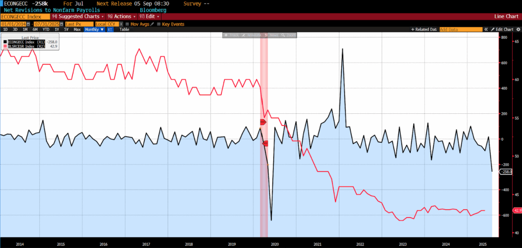 But it was the Friday, August 1 release of the July 2025 nonfarm payrolls (NFP) report — along with revisions to the May and June figures — that most caught the attention of markets and economic observers. The headline NFP print for July came in at just 73,000 jobs added — below consensus expectations of a 105,000 job gain. But it was the revisions that shocked: May’s number was revised down by 125,000 jobs, and June’s by 133,000; a staggering, cumulative downward adjustment of 258,000 jobs.