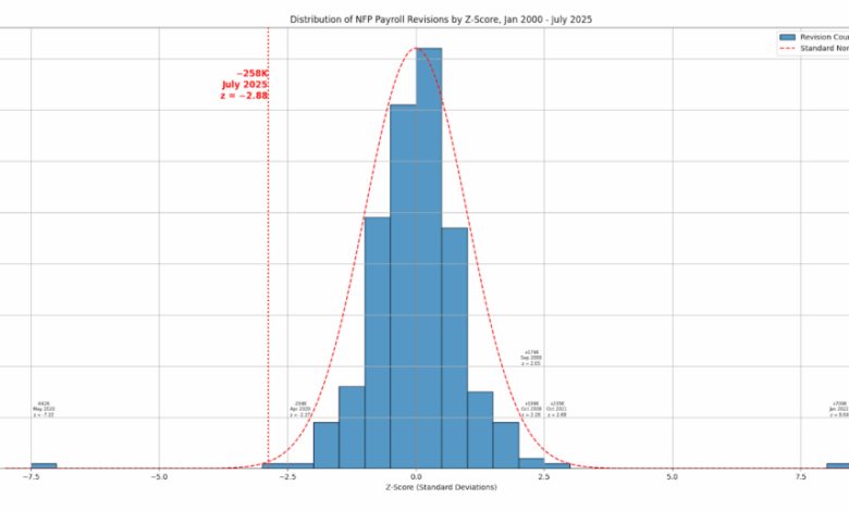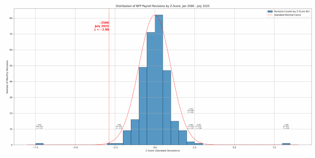 The July 2025 payroll revision figure of –258,000 drew attention not just for its magnitude, but for its apparent statistical improbability. With a z-score of –2.88 — meaning it lies nearly three standard deviations below the mean of historical revisions — the number stands out starkly against standard statistical benchmarks. Under the assumptions of a normal (Gaussian) distribution, a deviation of that size or greater would be expected to occur less than 0.2 percent of the time, or roughly once in every 500 observations. Given that the current dataset spans 306 months, the implication is clear: this is a rare event.