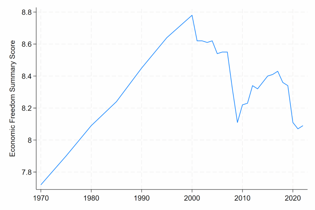 Smith still doesn’t understand libertarianism very well. That is evident from his repeated invocations of the George W. Bush Administration as a test of free-market policy. Yes, the same Bush Administration that exploded federal deficit spending, added a new entitlement program, nationalized airport security, raised the minimum wage, and signed into law one of the most costly regulatory expansions of this century in the Sarbanes-Oxley Act. The reality is that the era of neoliberal reform in the US lasted only from about 1975 to about 2000, and we’ve been in a period of statist retrenchment ever since. Economic freedom scores support this timeline (Figure 1).