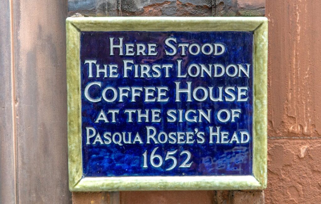 Commemorative plaque at the first coffee house in London, now site of The Jamaica Wine House. Shutterstock.