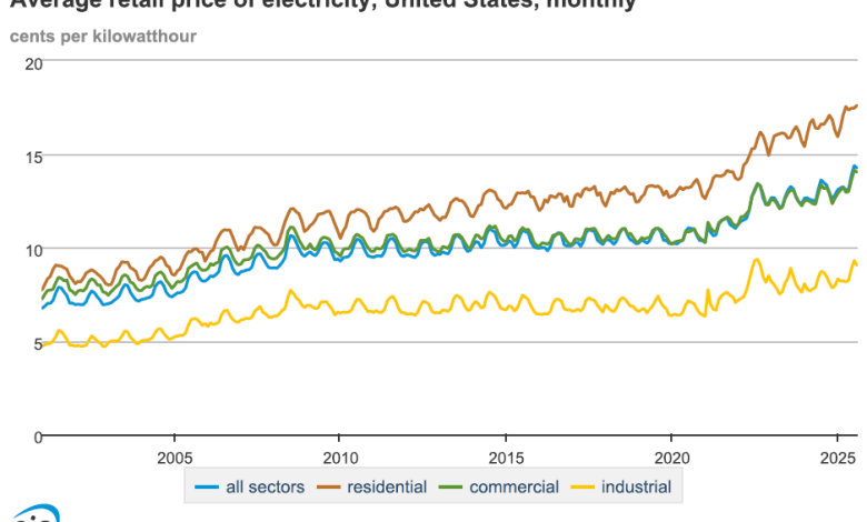Energy inflation tells the tale. Headline prices are running hotter than the 2 percent target, and the pressure points are concentrated in utilities. Electricity alone is up roughly 5 percent, and utility gas is up close to 12 percent versus a year ago. Average retail electricity prices have jumped nearly 9 percent already this year. The burden isn’t uniform. North Dakotans pay the lower energy costs, around 11.7¢ per kWh with a typical bill near $112, while Hawaiians pay roughly 42.3¢ and a $203 monthly tab. That gulf largely reflects system design and policy. North Dakota sits on abundant generation with strong ties to the Midcontinent grid; Hawaii is an islanded system importing fuel and equipment with layers of costs. When transmission is constrained and hardware is expensive, consumers pay.